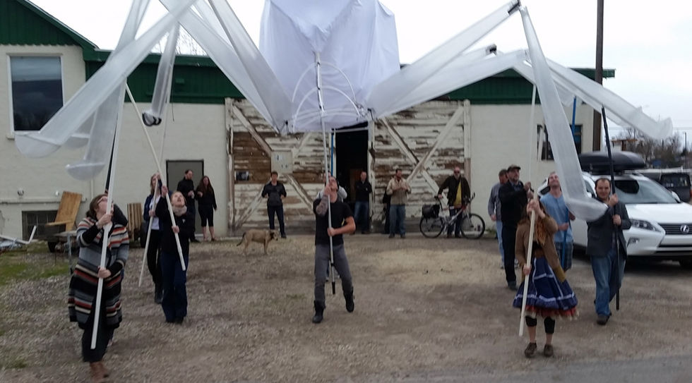Gertie the Galactic Arachnid was built in 2016. She was our fifth large-scale puppet, and was undoubtedly the most complicated and ambitious project we'd undertaken. Gertie stands roughly 15-feet tall, and has a max leg-span of over 30-feet! She requires eleven puppeteers to operate her: one for each leg, one for the abdomen, and two for the main body/head. Dozens of extremely passionate and skilled people helped to bring Gertie to life. Also, this project wouldn't have happened without the extreme generosity of What The Festival, Treefort Music Fest, Sensory Illumination, Trademark Sign Company, and of course the wonderful Idaho Burner Alliance that allowed us to build in their space.